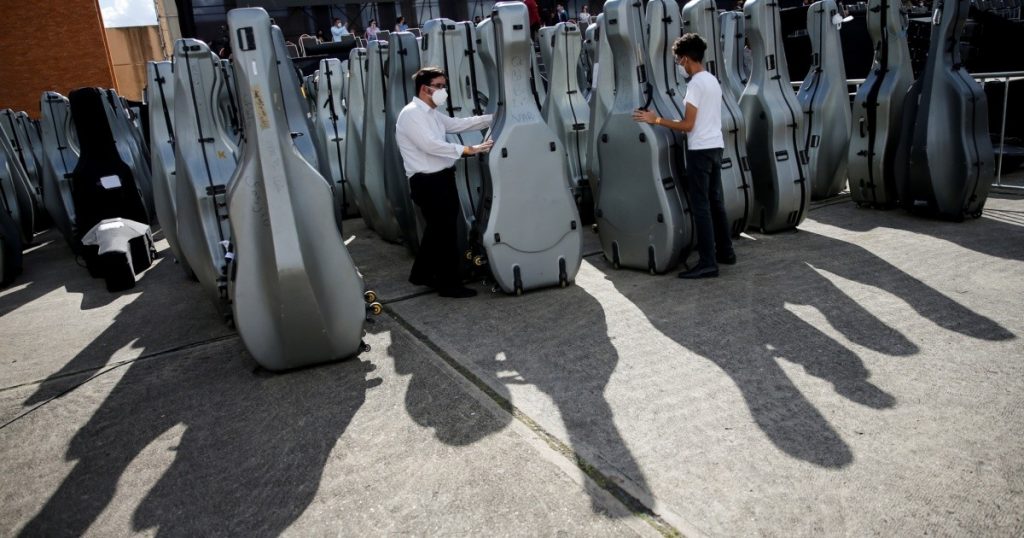 Los jóvenes músicos, con camisetas blancas, tocaban concentrados siguiendo la conducción de Ascanio a través de una pantalla que les permitía verlo a larga distancia.