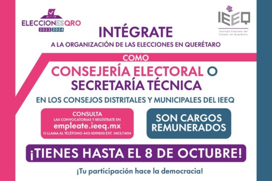 Entre las modificaciones se encuentra la ampliación del plazo de inscripción hasta las 16:00 horas del 8 de octubre del presente año; en el apartado de documentación, se contempla la posibilidad de presentar un certificado de antecedentes no penales y/o un escrito bajo protesta de decir verdad. Las personas interesadas podrán ingresar al portal empleate.ieeq.mx para conocer la convocatoria y realizar su registro o llamar al teléfono 442-1019800 Ext. 1403/1404 para obtener más información.