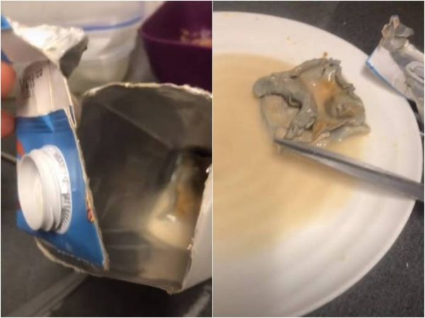 Una mujer encontró lo que podría ser un animal acuático muerto al fondo de un cartón de leche de almendras,...