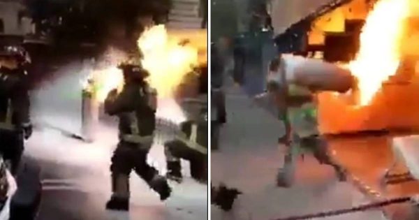 Las imágenes son impresionantes Playa Mangueras.- Un bombero fue captado cargando un tanque de gas en sus hombros en pleno...