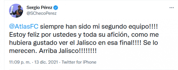 El piloto de F1 Sergio "Checo" Pérez tiene un equipo favorito en el futbol mexicano y ese es las Águilas...