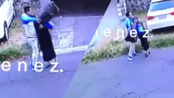 Una cámara de seguridad capto el momento en que un hombre estrangula por la espalda a una mujer de la...