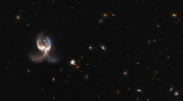 Después de una colisión cósmica entre dos galaxias, el Telescopio Hubble registró cómo un par de ‘alas de ángel’ se...