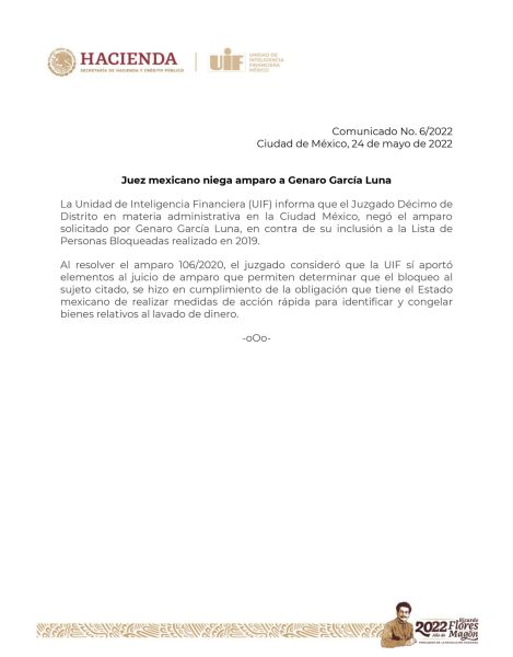 La Unidad de Inteligencia Financiera (UIF) informó que le fue negado el amparo a Genaro García Luna –exsecretario de Seguridad...