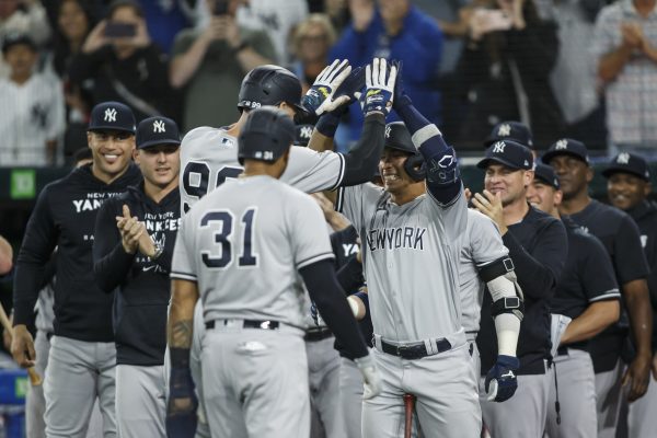 Aaron Judge llega al home y celebra con sus compañeros luego de disparar el cuadrangular 61 de la temporada. Foto:...