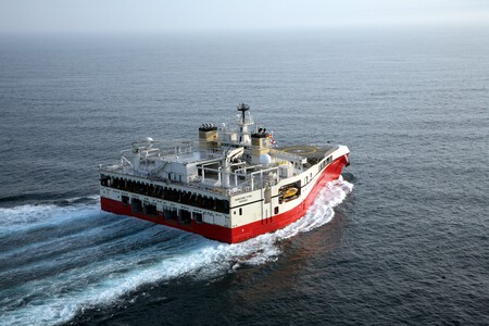 Visto a lo lejos, en mitad del océano, el Ramform Titan más parece los restos de un buque cercenado que...