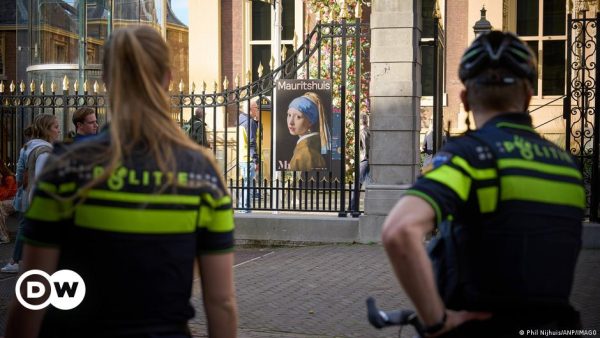 Una persona pegó su cabeza al vidrio que cubre el famoso cuadro "La Joven de la Perla", mientras otra vertía...