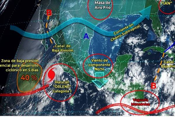 Lluvias puntuales a intensas en 10 entidades por huracán Orlene, categoría 1 en la escala Saffir Simpson. Por otra parte...