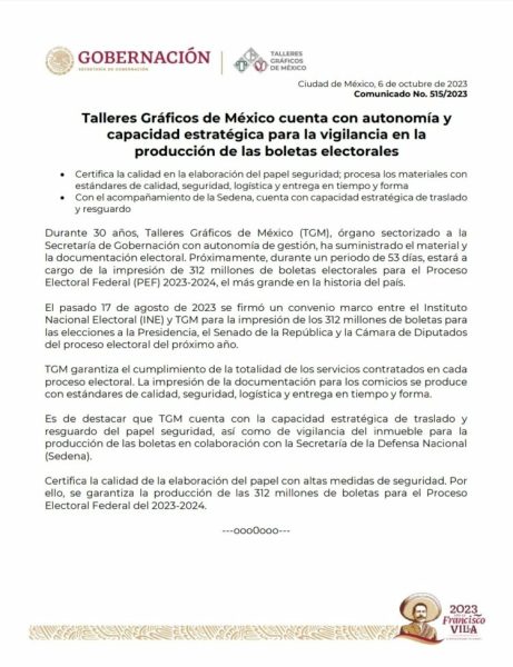 Este viernes 6 de octubre, la Secretaría de Gobernación (SEGOB) publicó un comunicado para informar que el órgano “Talleres Gráficos...