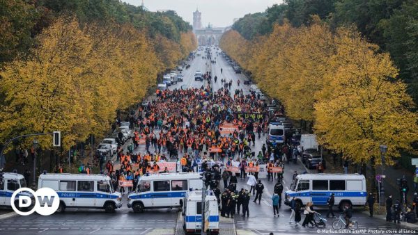 Cientos de activistas climáticos, según cifras de la policía, bloquearon este sábado (28.10.2023) la Avenida 17 de Junio, en el...