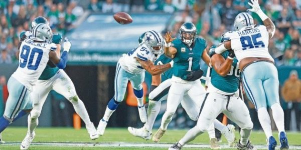 Jalen Hurts mostró valentía al soportar un golpe directo hacia su lesionada rodilla izquierda para totalizar 207 yardas y dos...