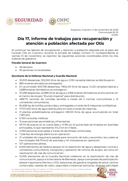 Este sábado se cumplieron 17 días de trabajos para levantar a Acapulco tras el paso del huracán Otis por Guerrero....