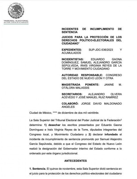 La magistrada Otálora Malassis mandó un proyecto en el que desecha la queja de Samuel García en contra del nombramiento...