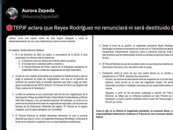 Reyes Rodríguez Mondragón presentó su informe anual ante la Suprema Corte, donde destacó la ausencia de magistrados del Tribunal Electoral....