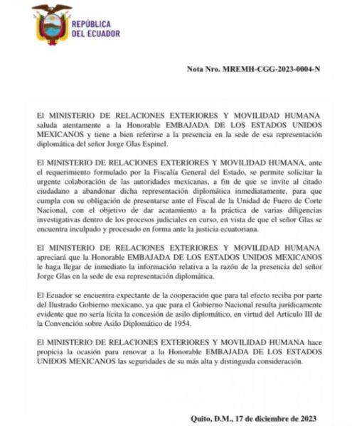 Jorge Glas se encuentra en la embajada de México en Quito en calidad de 'huésped' pese a su orden de...