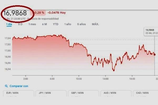 El dólar estadounidense cotizó al cierre a 16,98 pesos mexicanos en promedio, la sesión previa, finalizó con 17,03 pesos mexicanos...
