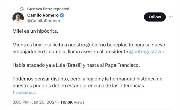 Durante su visita al Pacífico colombiano, el presidente Gustavo Petro respondió a Javier Milei, que lo tildó de “comunista asesino...