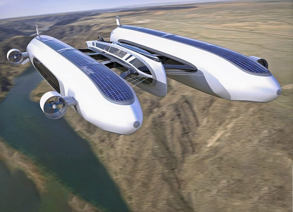 El concepto se compone de dos dirigibles de 150 m conectados a un casco central de 80 m mediante cuatro puentes de carbono a cada lado.