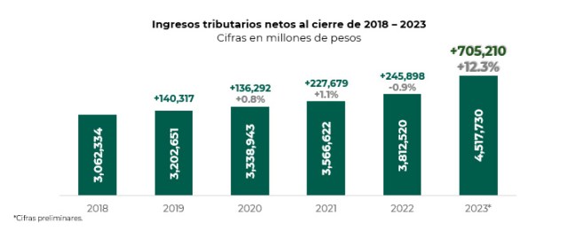 El SAT informa que, al cierre de 2023, la recaudación tributaria acumulada alcanzó 4 billones 517 mil 730 millones de pesos, lo que representa un crecimiento real de 12.3% respecto a 2022.