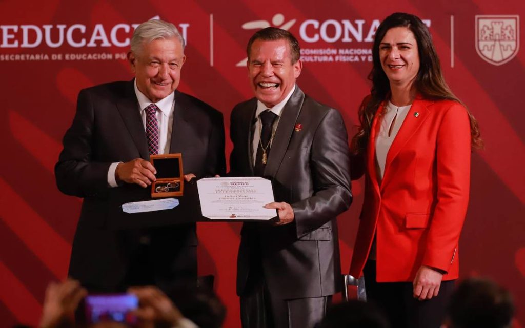 López Obrador también felicitó en particular al boxeador Julio César Chávez y le dedicó unas palabras: “Muchas felicidades. Le decía a Julio Cesar ahora: ‘qué bueno que no le habían dado el premio’, porque se tardaron en darle el reconocimiento, me tocó a mí entregarle”.