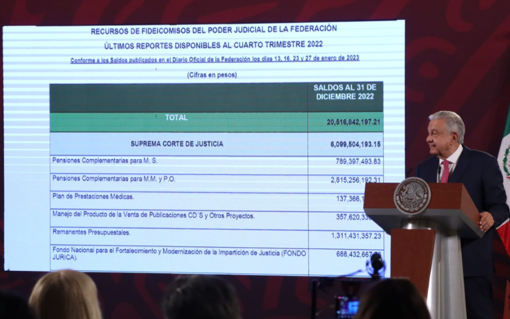 En un nuevo cuestionamiento al Poder Judicial Federal, el presidente Andrés Manuel López Obrador exhibió en su conferencia matutina un fideicomiso de más de 20 mil millones de pesos destinado para mantenimiento de casas, gastos médicos, entre otras partidas.