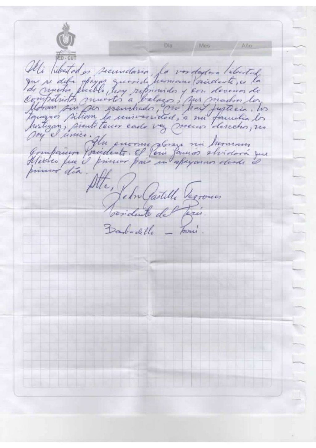 Además, el mandatario mexicano compartió una carta que le envió Castillo escrita a puño y letra por él desde su celda.