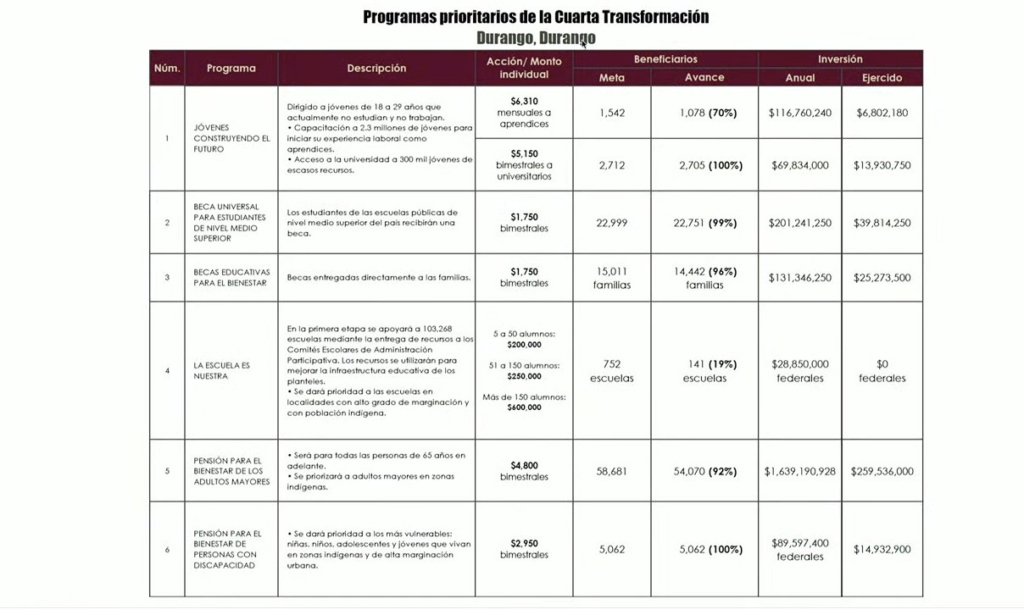 Más tarde, casi al culminar la mañanera, AMLO expuso como se han repartido los apoyos del Bienestar en Durango, habiendo mil 078 beneficiarios de Jóvenes Construyendo el Futuro, 2 mil 705 universitarios becados, 22 mil 751 becas para alumnos de bachillerato, 14 mil 442 becarios de educación para el bienestar y 141 planteles en el programa “la escuela es nuestra”.