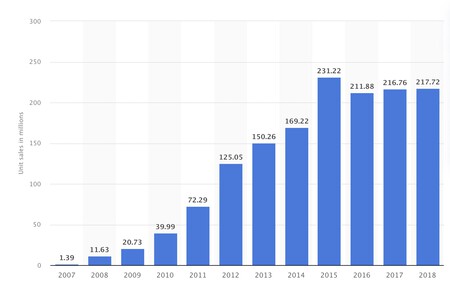 Ventas de los iPhone hasta 2018: en 2015 las ventas se dispararon y la razón fue una y solo una: la llegada de los iPhone 6/Plus y de sus pantallas más grandes. Fuente: Statista.