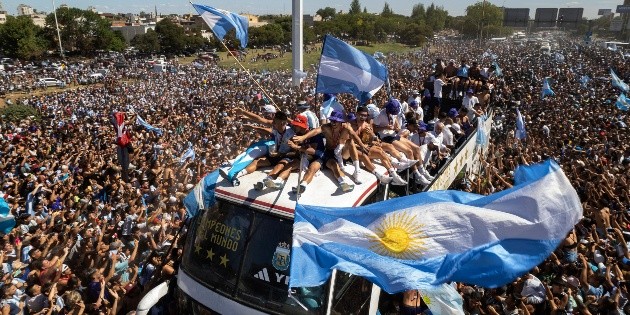 Lionel Messi y la Selección de Argentina campeona del mundo dejaron el autobús en el que se desplazaba por Buenos Aires para celebrar su título mundial con millones de hinchas y saludaron desde un helicóptero, pues la gran aglomeración de gente impidió que prosiguieran por tierra al céntrico Obelisco.