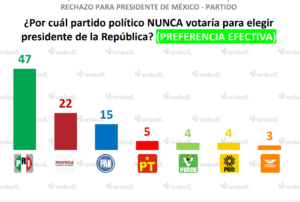En contra partida, Morena suma 22% del público que no votaría por este partido. En tanto que un 15% manifestó su rechazo al Partido Acción Nacional (PAN).