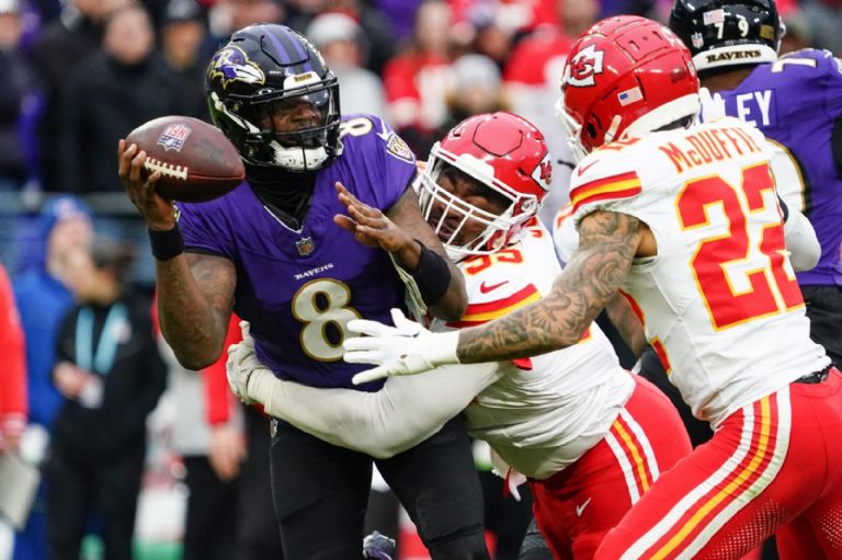 Los primeros invitados al Super Bowl fueron los Kansas City Chiefs, quienes se llevaron el título de la Conferencia Americana tras vencer a los favoritos, los Baltimore Ravens 7-17 en su casa. Lamar Jackson no pudo cumplir con la etiqueta que su equipo tenía como los favoritos, ya que fueron el mejor equipo en temporada regular.