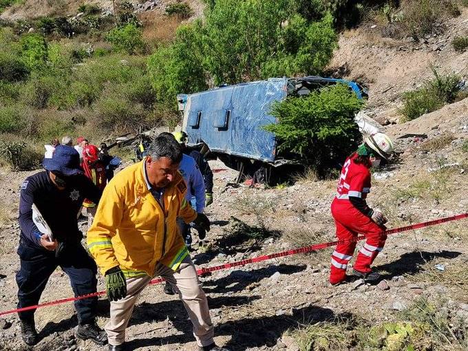 Un autobús que transportaba migrantes centroamericanos, perdió el control y cayó al fondo de un barranco en Mexquitic de Carmona, San Luis Potosí.