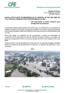 La Comisión Federal de Electricidad (CFE), por su parte, emitió un comunicado en el que informó sobre las acciones adoptadas tras las inundaciones. Entre estas se encontraron la instalación de una planta de emergencia de 5 kilowatts para el hospital y el corte de energía eléctrica en el centro de Tula, con el fin de garantizar la seguridad de la población.