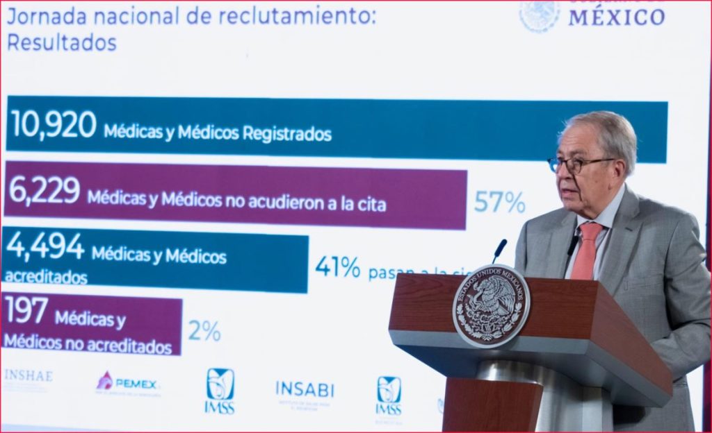 De 10 mil 920 médicas y médicos especialistas registrados, 4 mil 494 acreditados pasaron a la siguiente etapa; 6 mil 229 no acudieron a la cita de recepción y 197 no acreditaron su especialidad, lo que representa el dos por ciento.