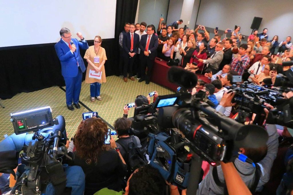 Después de un acuerdo colectivo entre los candidatos con los representantes de las tres fuerzas políticas que integran esa coalición: Morena-PT-PV, se determinó dar el anuncio final e informar a la población el resultado de las cinco encuestas, en donde Claudia obtenía un triunfo inobjetable y aplastante ante los demás contendientes.