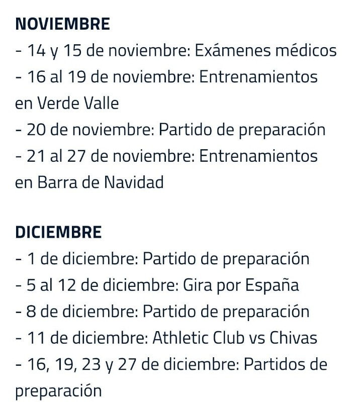 Posteriormente, del 5 al 12 de diciembre Chivas emprenderá su gira por España, país en donde los rojiblancos enfrentarán un par de duelos entre los que destaca el que sostendrán contra el Bilbao el día 11 de ese mes.