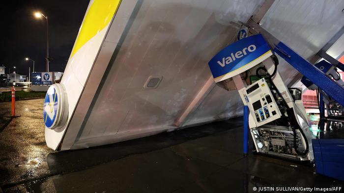 Surtidores de gasolina fueron aplastados por el techo de una gasolinera Valero que fue derribado por los fuertes vientos en el sur de San Francisco. (Archivo 04.01.2023)