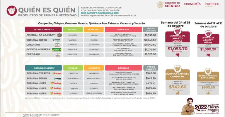 Central de Abasto Mérida dio el costo más alto con un total de $1,053.70 pesos por los 24 productos de la canasta básica. Por su lado, Soriana Express Campeche en la capital del estado ofreció los mejores precios con $942.60 pesos por los 24 productos.