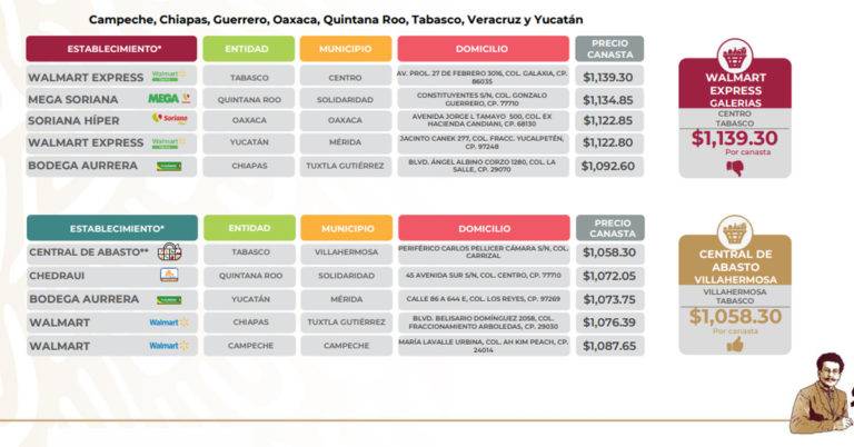 El establecimiento con la lista de precios más cara fue Walmart Express Galerías, en centro de Tabasco con un precio de 1,139.30 pesos. Mientras que el lugar con la canasta más barata se encuentra en en Central de Abasto en Villahermosa, Tabasco con un precio de 1,058.30 pesos.