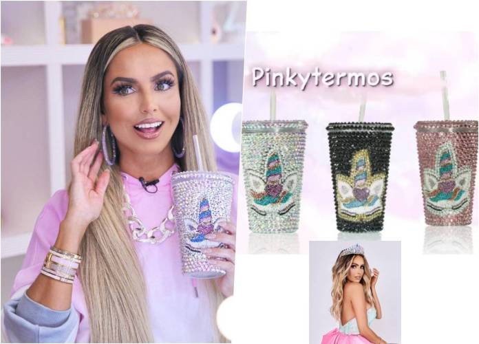 Los productos que lanzó Karla Díaz consisten en unos vasos de plástico cubiertos con pedrería para manualidades, cuyo diseño tienen al frente un unicornio.