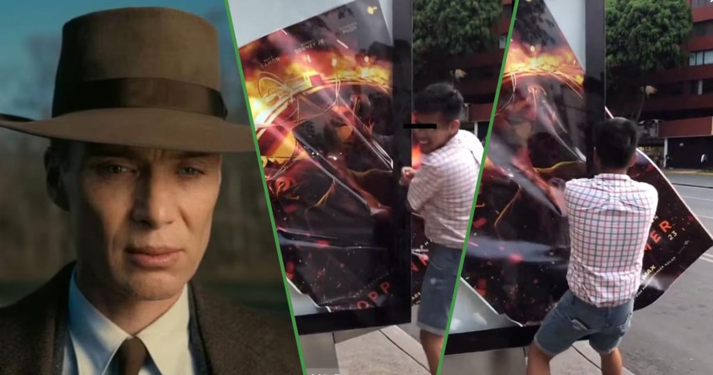 Estación de los arrancones.- Un sujeto fue captado arrancando un cartelón de la peli Oppenheimer que está por llegar a los cines de todo el mundo, incluyendo a nuestro país.
