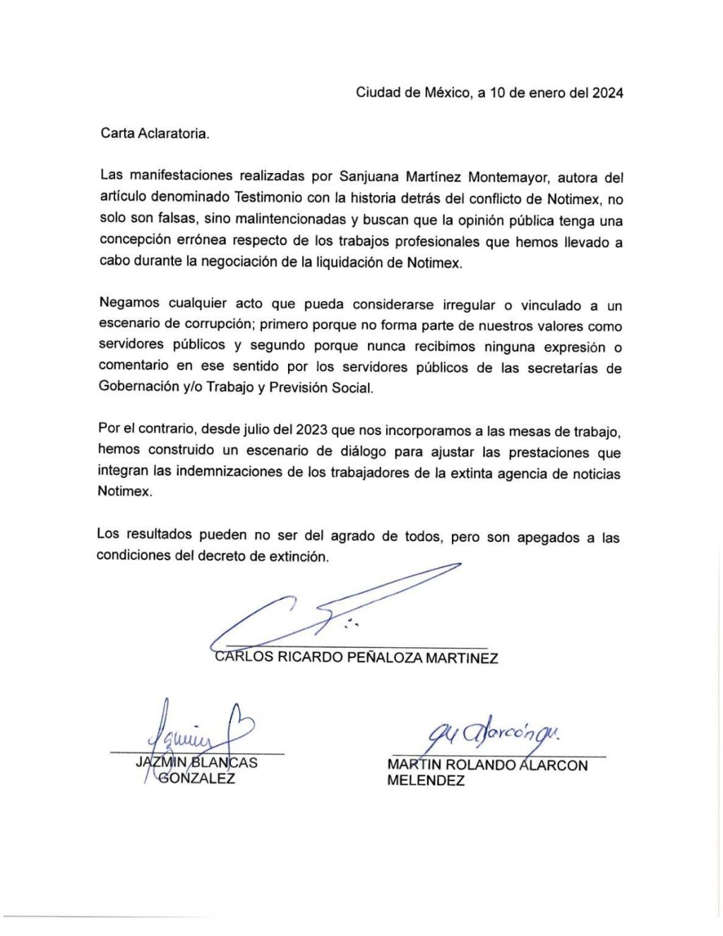 Cabe destacar que en la carta a Proceso, Peñaloza rechaza lo que Sanjuana Martínez exdirectora de Notimex dice en su testimonio publicado por La Jornada.