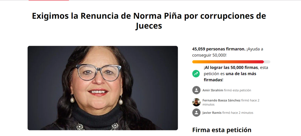 A través de la plataforma change.org, ciudadanos de México exigen la renuncia de la ministra Norma Piña por corrupciones de jueces.