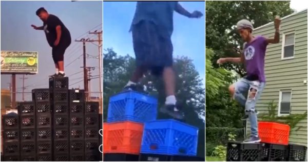 El desafío consiste en formar una pirámide con cajas de leche plásticas e intentar subirla por un lado y bajar...