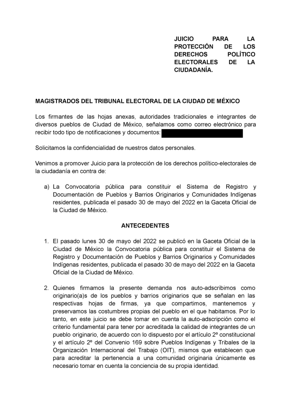 El jueves 3 de junio, la demanda TECDMX-JLDC-057/2022 fue interpuesta en el Tribunal por el Frente por la Defensa de los Derechos de los Pueblos y Barrios de la Cuenca del Anáhuac, con el fin de que los magistrados declaren la nulidad del Sistema de Registro y Documentación de Pueblos y Barrios Originarios y Comunidades Indígenas Residentes, publicado el 30 de mayo como una convocatoria por la Secretaría de Pueblos y Barrios Originarios y Comunidades Residentes (Sepi), encabezada por Laura Ruiz Mondragón.