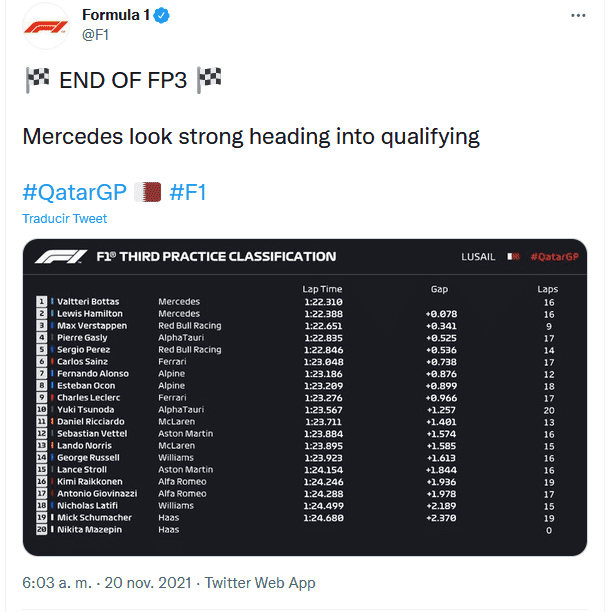 Sean o no relevantes los datos extraídos, en la sesión fueron más rápidos los Mercedes -beneficiándose, quizás, de la larga recta de meta, de más de un kilómetro- que los Red Bull de Verstappen y «Checo» Pérez; entre los que se coló al final el francés Pierre Gasly (Alpha Tauri), cuarto crono de un entrenamiento en el que todos marcaron sus vueltas rápidas con la goma blanda.