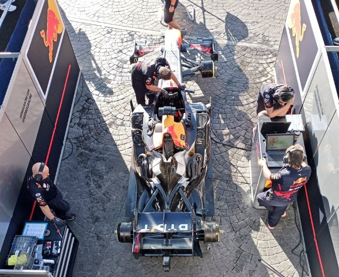 Asistentes en el lugar donde se correrá el Red Bull Show Run 2022 informan que la escudería llegó a la ciudad con dos RB7, uno de respaldo por si falla el principal.