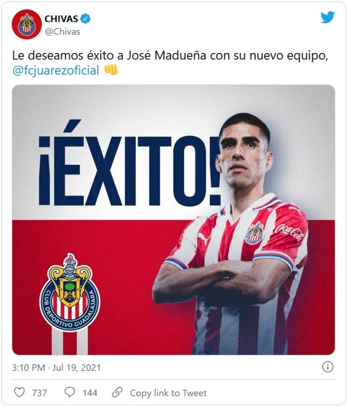 Asimismo, la tarde de este lunes el equipo del Guadalajara confirmó un secreto a voces a través de sus redes sociales, pues hizo oficial la baja de José Madueña rumbo al arranque del siguiente certamen.