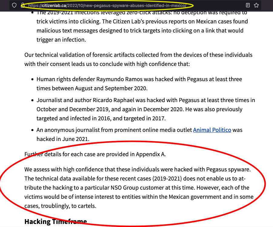 “Validamos las infecciones de Pegasus 2019-2021 mediante análisis forense a los dispositivos. Los hallazgos anteriores de Citizen Lab en México sólo confirmaron la orientación de Pegasus (como lo demuestra un mensaje malicioso enviado a un dispositivo). Las infecciones de 2019-2021 aprovecharon los ataques de clic cero: no se requirió engaño para que las víctimas hicieran clic. Los informes anteriores de Citizen Lab sobre casos mexicanos encontraron mensajes de texto maliciosos diseñados para engañar a los objetivos para que hicieran clic en un enlace que desencadenaría una infección.”