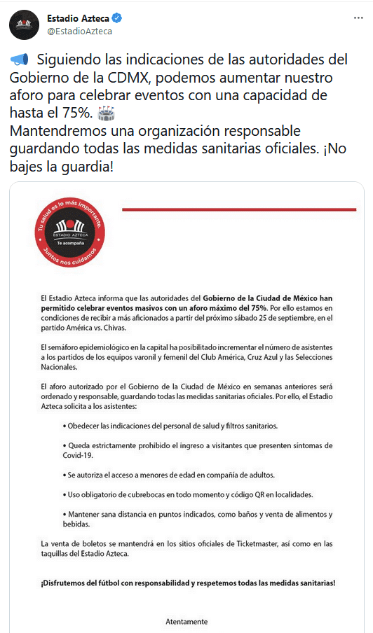 El Estadio Azteca informó que recibió la autorización por parte del las autoridades del Gobierno de la Ciudad de México para permitir el acceso a un máximo del 75 por ciento de la capacidad del inmueble.